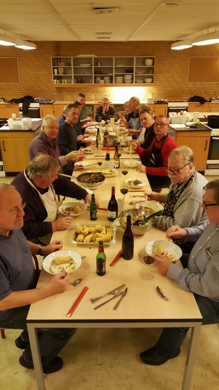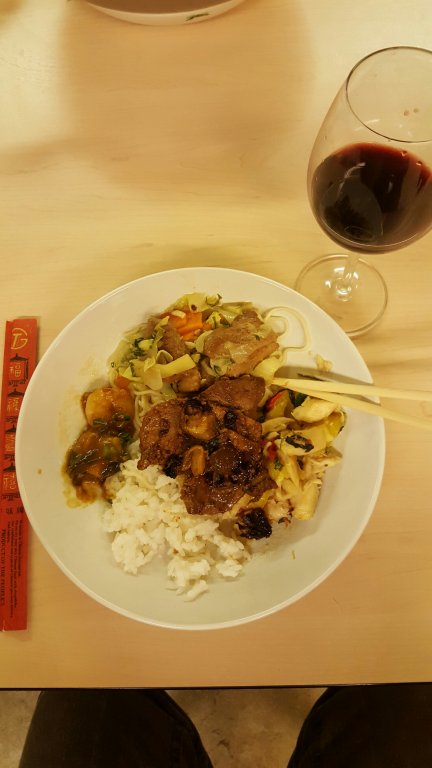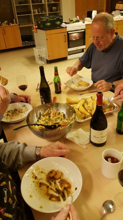 Det hele svitses i en stor gryde i sesamolie og krydres med soyasovs og hakkede koriander og evt. lidt salt.