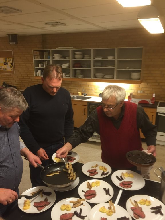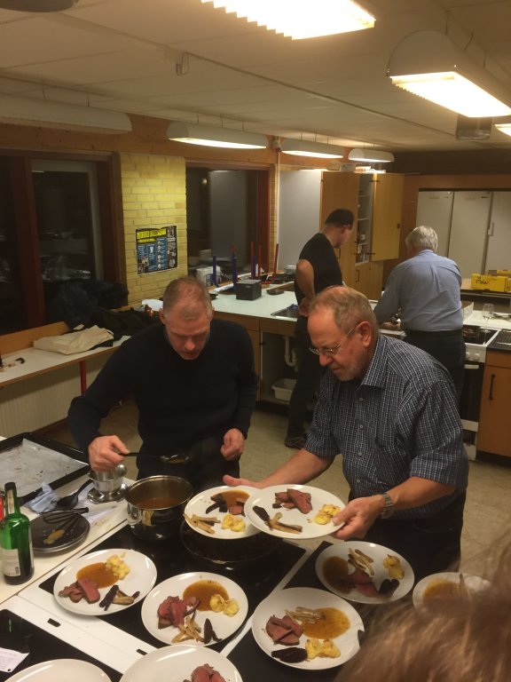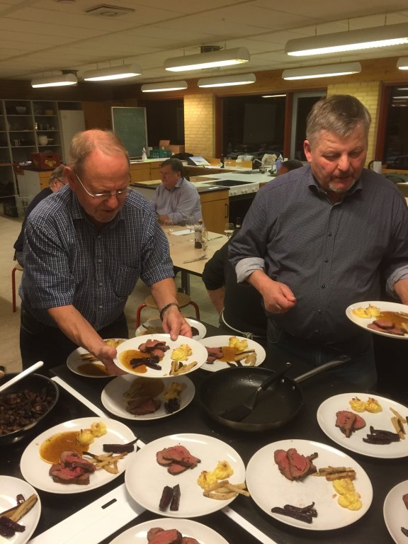 Tages af ilden og tilsættes 1 l brun fond og koges i en time under jævnlig omrøring for ikke at brænde på, tilsæt bradepandeafkoget.
